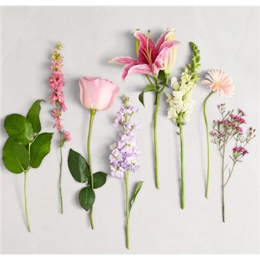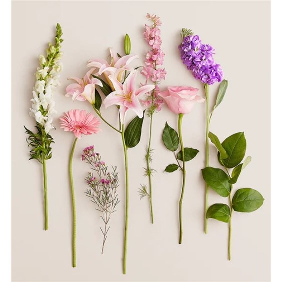 All-around arrangement with pink roses, Oriental lilies, Gerbera daisies and larkspur; white snapdragons, lavender stock and purple waxflower; accented with assorted greenery